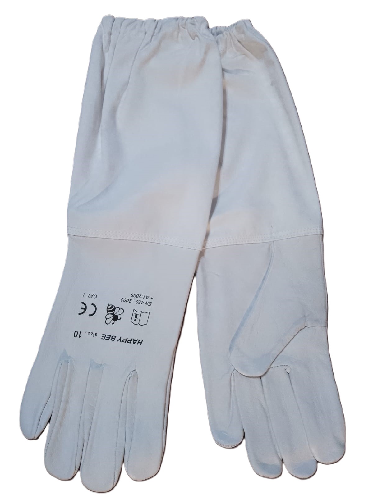 Rukavice jsou vyrobeny z pevné vepřovicové kůže a zakončeny textilní manžetou, která zvyšuje ochranu zápěstí. Elastické zakončení pomáhá zabránit vniknutí včel pod rukavici a přispívá k bezpečné a klidné práci u úlů.